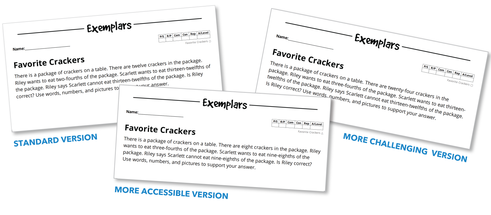 Exemplars instructional tasks are differentiated at 3 entry points, allowing easy integration in mixed-ability classrooms. These problems may also be used for formative assessment. There are 4 or more instructional tasks provided for each Unit of Study.
